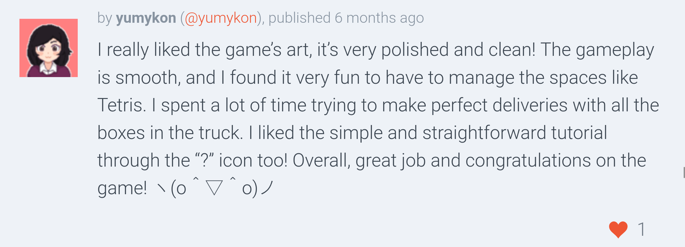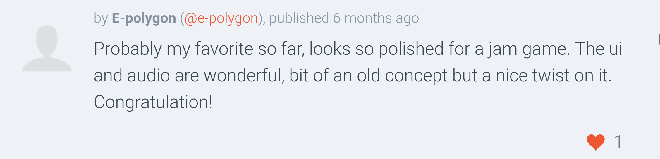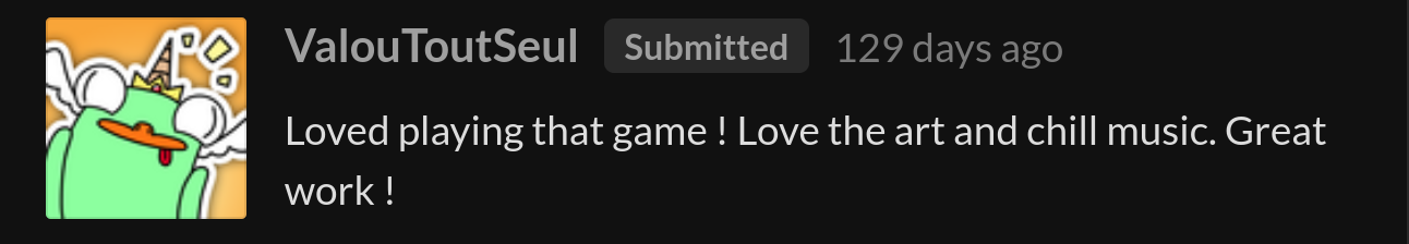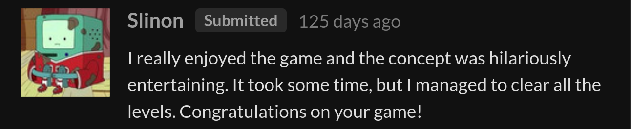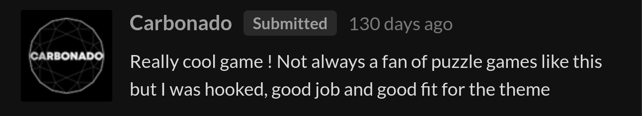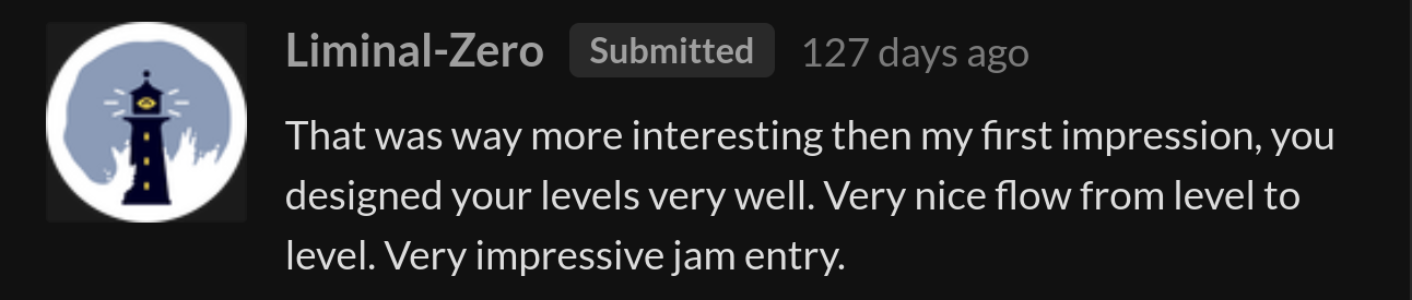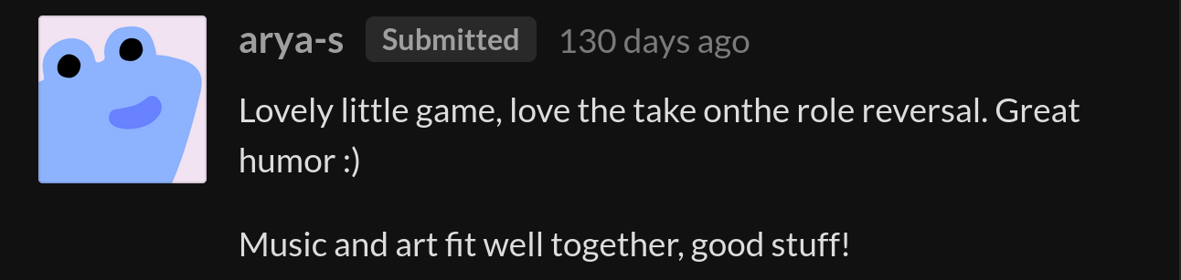 The game was well received by the community, ranking #73 overall and #48 in fun out of 1720 Jam submissions.