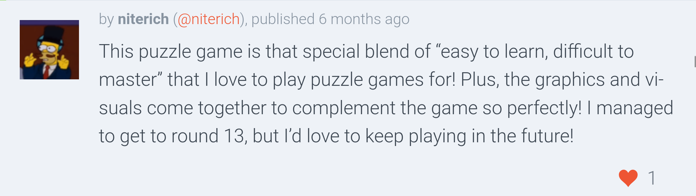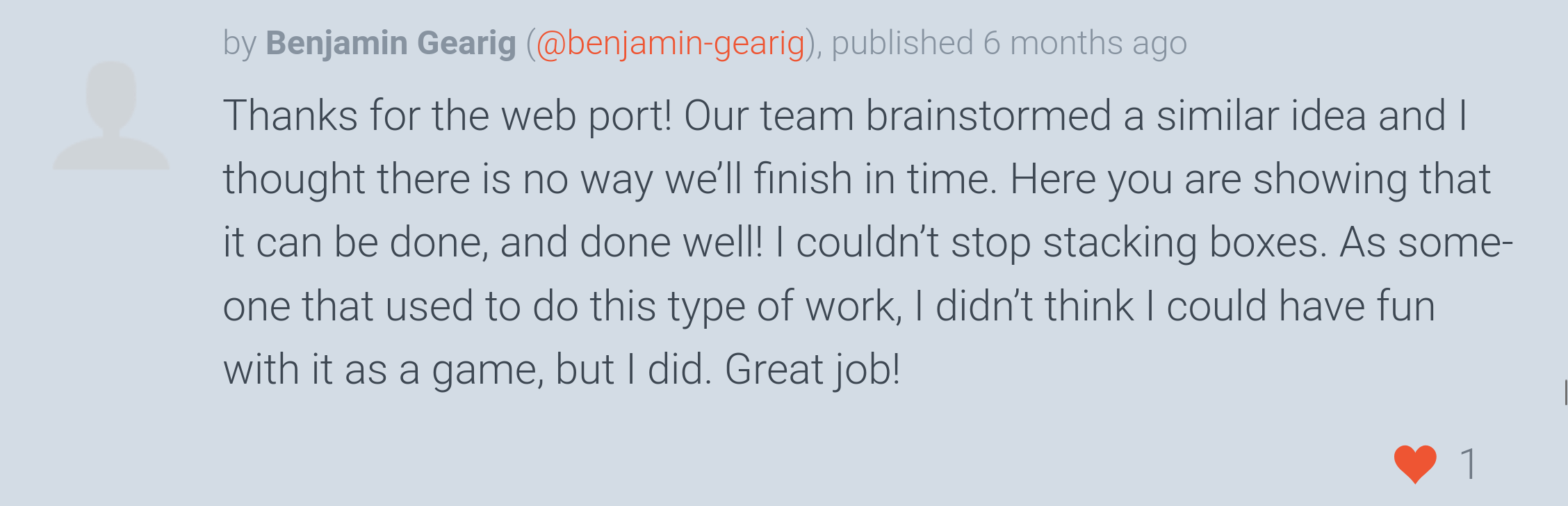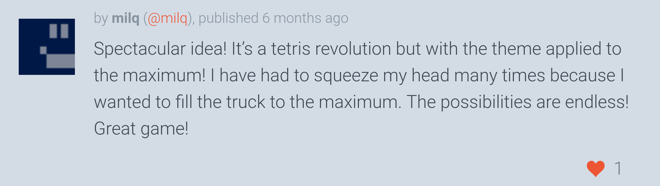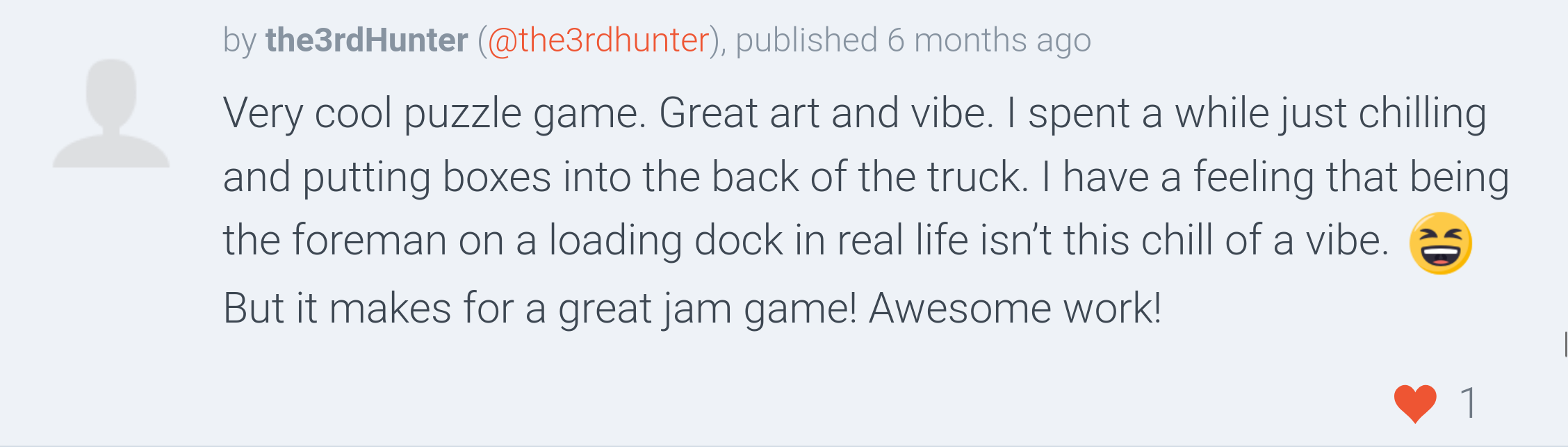 The game was well received by the community, ranking #73 overall and #48 in fun out of 1720 Jam submissions.